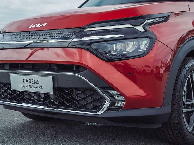 Thiết kế đèn pha và đèn hậu của Kia Carens 2023 dễ gợi liên tưởng đến mẫu Sportage thế hệ mới nhất. Lưới tản nhiệt mũi hổ 2 tầng nối liền với dải đèn LED định vị ban ngày có thiết kế độc đáo.