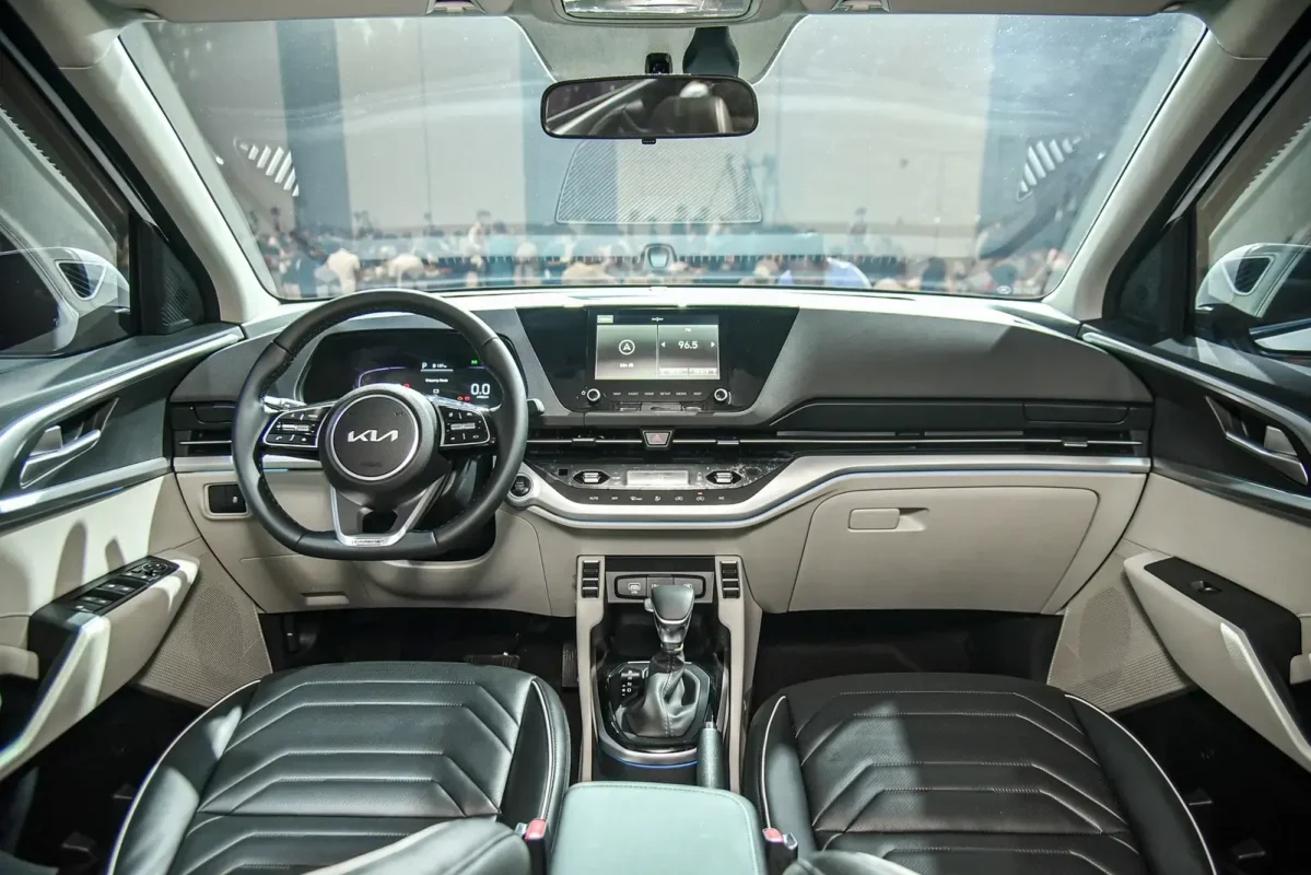 Thiết kế khoang cabin của Kia Carens 2026 gọn gàng, hiện đại với cụm đồng hồ đo kỹ thuật số 12.5” sắc nét, có thể thay đổi giao diện màu theo từng chế độ lái Eco/Normal/Sport và màn hình trung tâm giải trí cỡ lớn 10.25” kết nối thông minh Apple Carplay không dây/Android Auto tích hợp định vị dẫn đường. Vô lăng 3 chấu thiết kế D cut thể thao tích hợp nhiều phím chức năng.