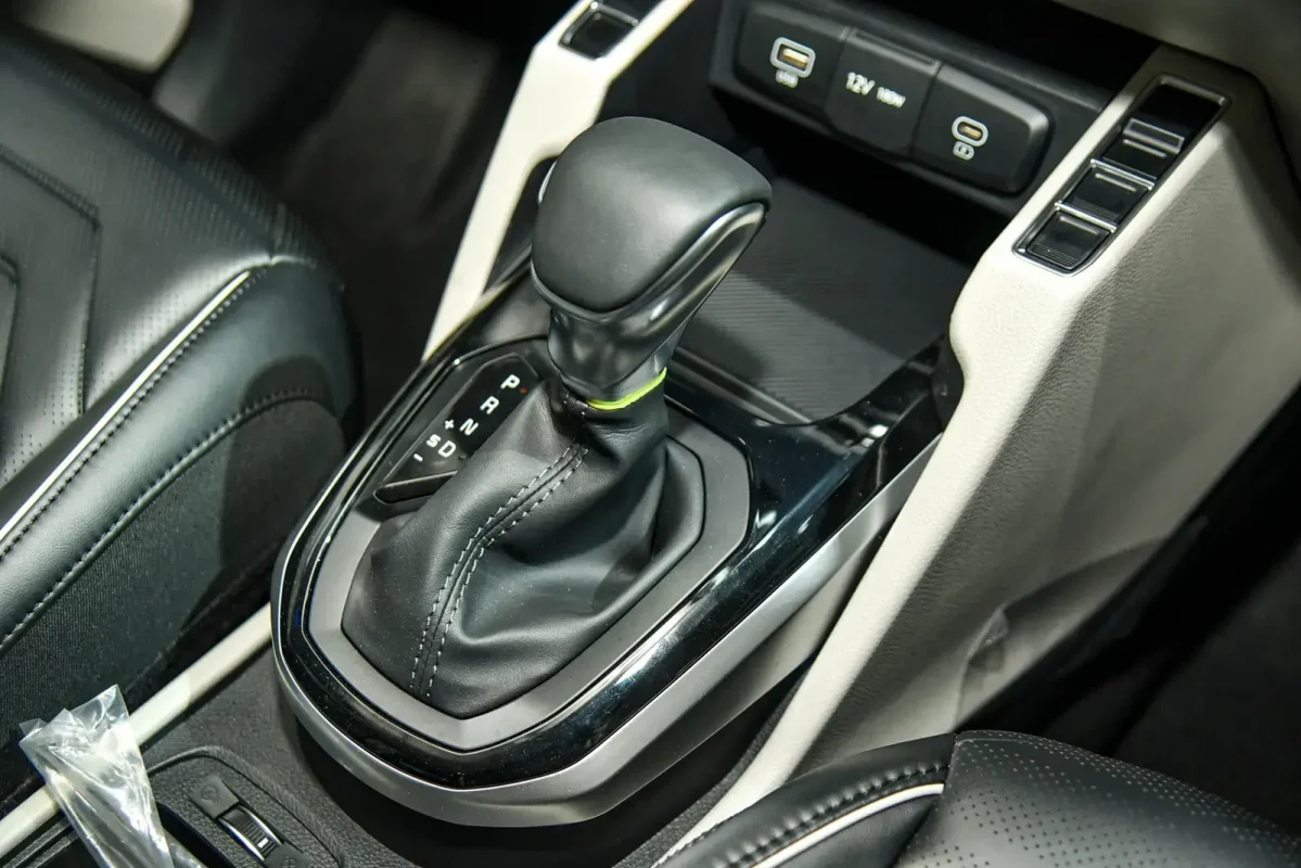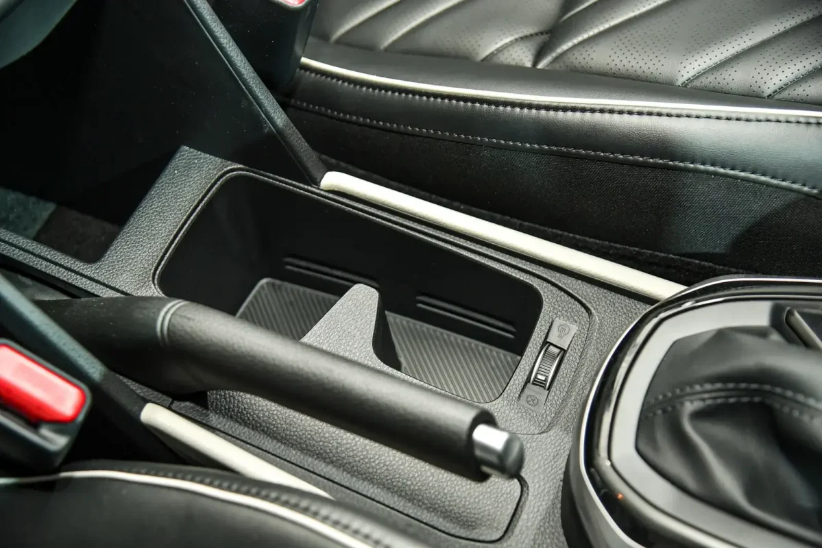 Ở khu vực bệ trung tâm, xe sử dụng cần số truyền thống. Phía trước có hộc chứa đồ nhưng thiếu đi sạc không dây so với bản cao hơn. Dãy nút bấm của các tính năng như làm mát ghế, bật/tắt cảm biến, kích hoạt nhanh camera lùi, chế độ lái… đã bị lược bỏ trên Carens 1.5L xăng Luxury vì đây là những tính năng không được trang bị.