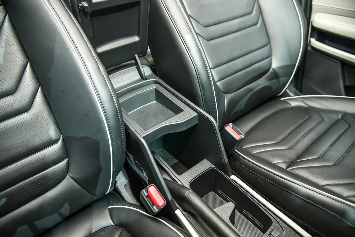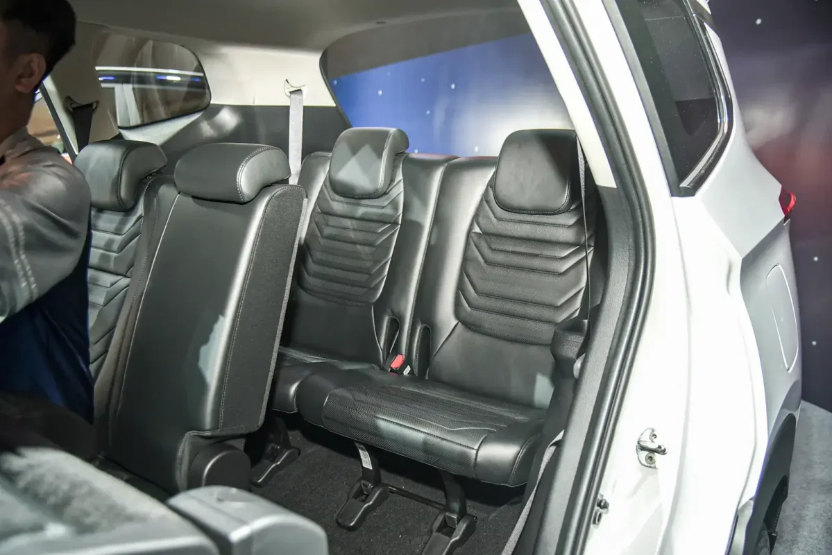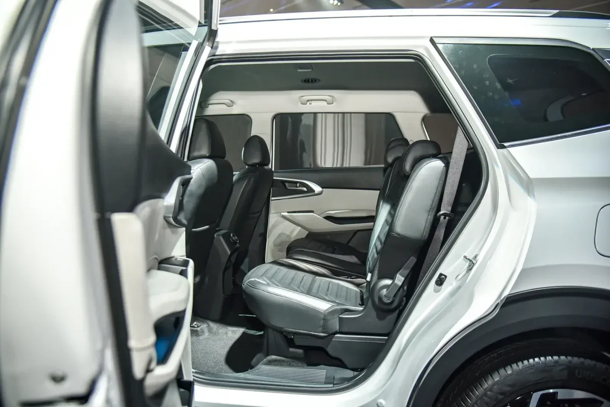 Ba hàng ghế bọc da tối màu. Hàng ghế thứ ba có độ ngả sâu so với các đối thủ.