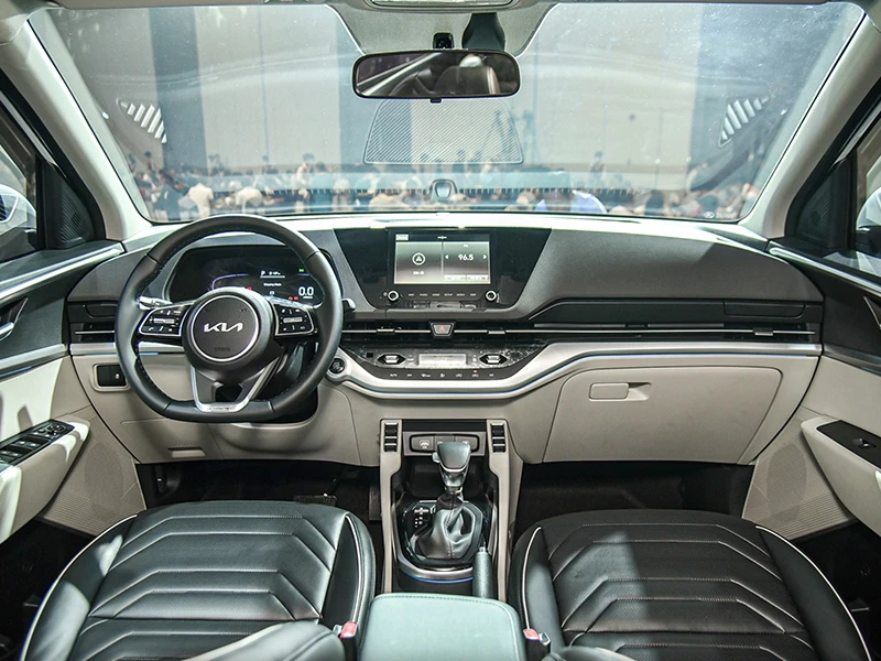 Thiết kế khoang cabin của Kia Carens 2023 gọn gàng, hiện đại với cụm đồng hồ đo kỹ thuật số 12.5” sắc nét, có thể thay đổi giao diện màu theo từng chế độ lái Eco/Normal/Sport  và màn hình trung tâm giải trí cỡ lớn 10.25” kết nối thông minh Apple Carplay không dây/Android Auto tích hợp định vị dẫn đường. Vô lăng 3 chấu thiết kế D cut thể thao tích hợp nhiều phím chức năng.