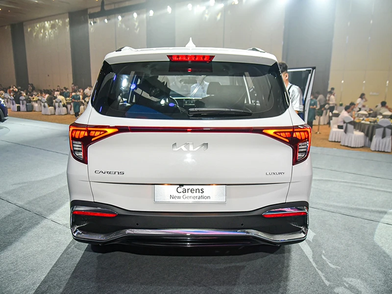 Thiết kế đèn pha và đèn hậu của Kia Carens 2023 dễ gợi liên tưởng đến mẫu Sportage thế hệ mới nhất. Lưới tản nhiệt mũi hổ 2 tầng nối liền với dải đèn LED định vị ban ngày có thiết kế độc đáo.