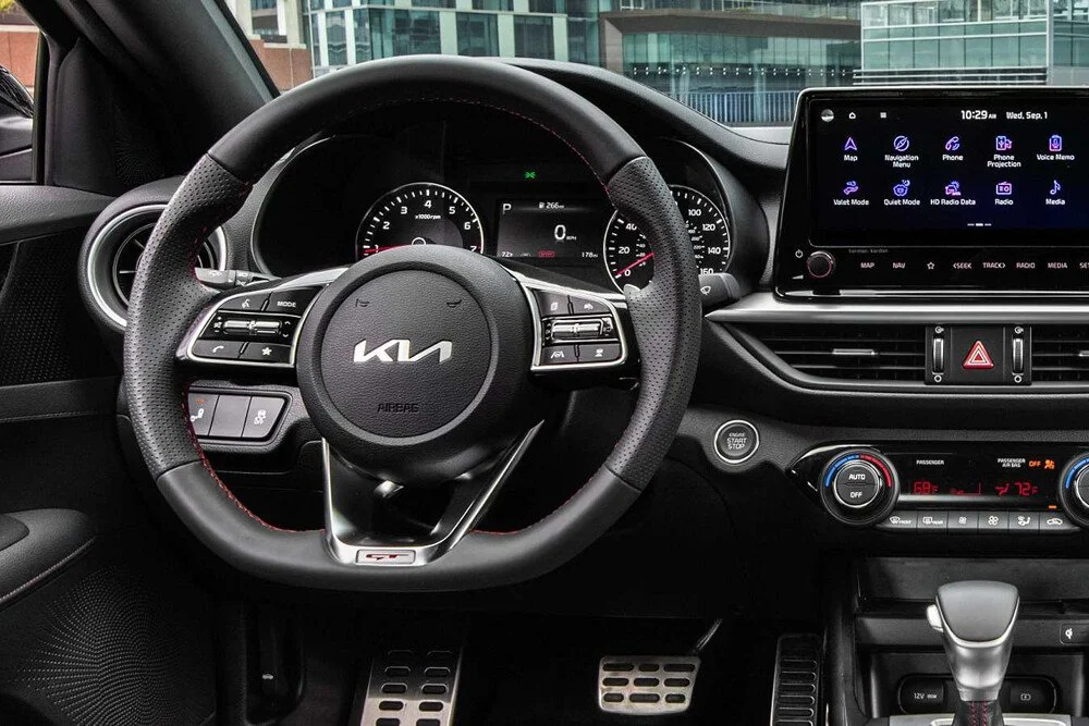 Cabin xe KIA K3 1.6 Turbo GT sử dụng tông đen sang trọng với điểm nhấn là các viền chỉ đỏ nổi bật. Hàng ghế trước có logo GT màu đỏ được thêu nổi trên lưng ghế, thiết kế vô lăng D-cut thể thao, ốp bàn đạp kim loại sáng bóng, chụp cần số thêu chỉ đỏ là những điểm nhấn tạo nên dấu ấn giúp phân biệt với các phiên bản trước.