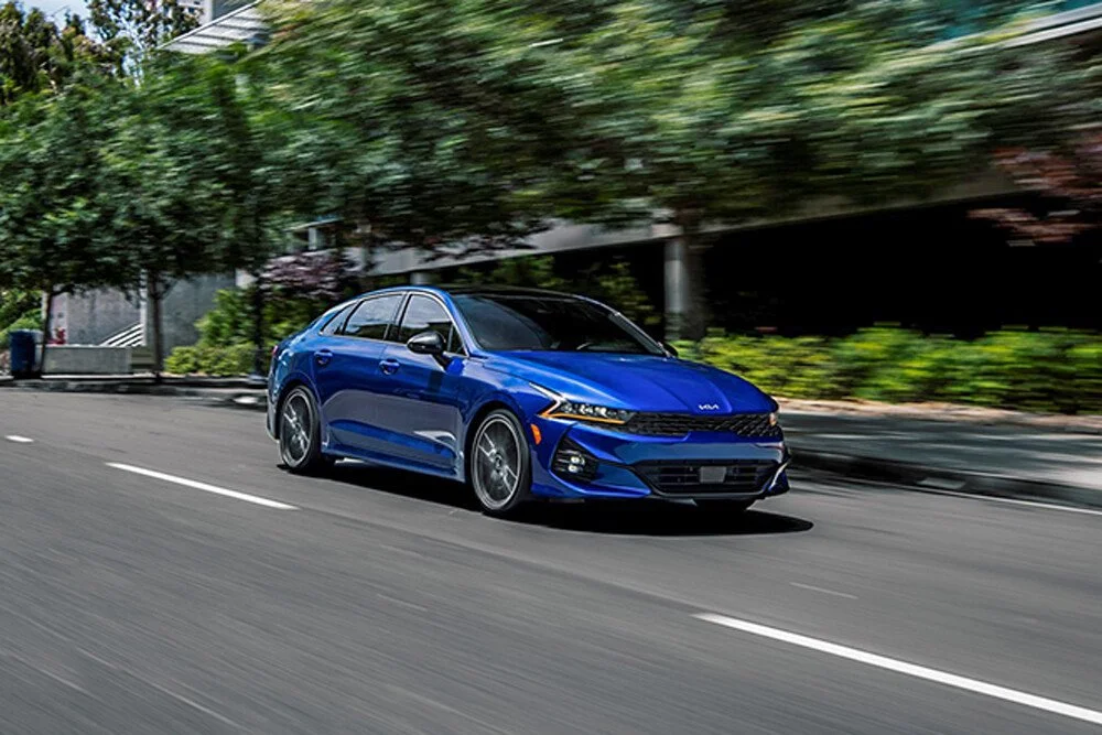 Đầu xe sử dụng lưới tản nhiệt dạng mũi hổ đặc trưng nhưng có kích thước lớn hơn và thiết kế dữ dằn hơn. Xe được trang bị đèn chiếu sáng LED Projector. Thiết kế dải đèn LED chạy ban ngày màu hổ phách với hình dáng chữ “L” được uốn cong bao trọn cụm đèn pha. K5 sử dụng đèn sương mù trước LED. Hốc hút gió được với tạo hình hầm hố được đặt phía dưới giúp tăng tính khí động học cho xe.