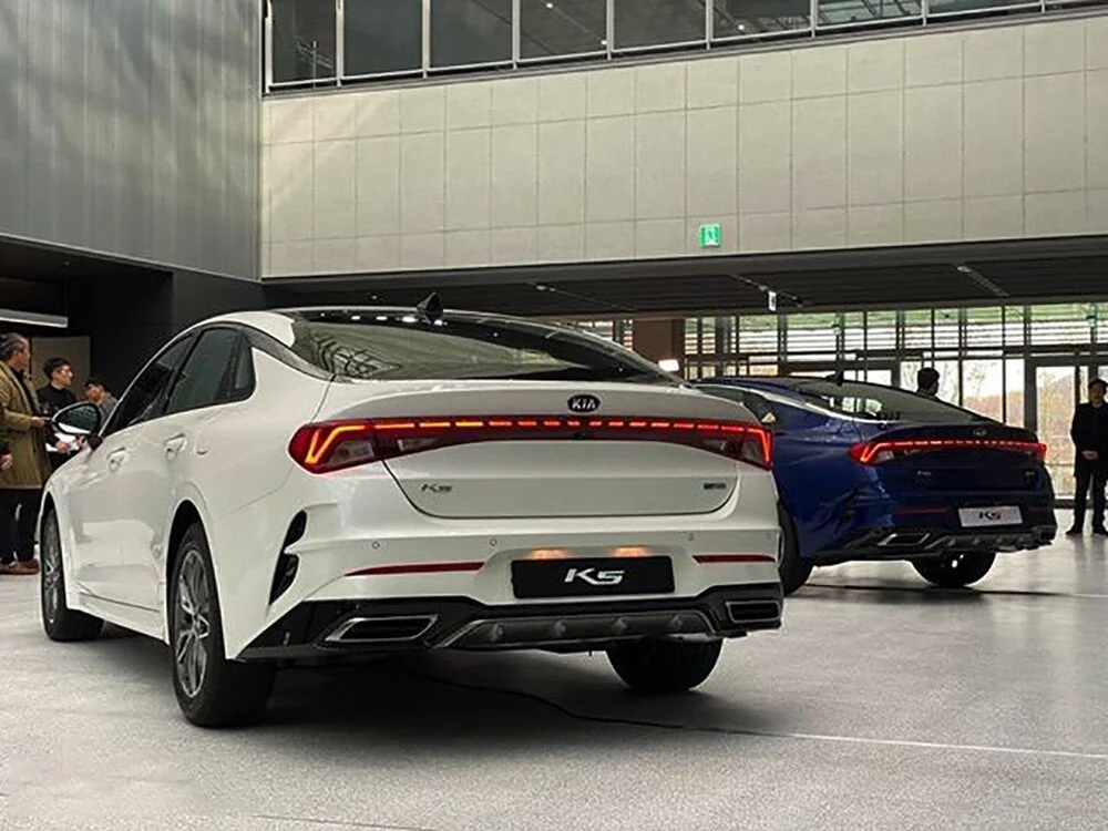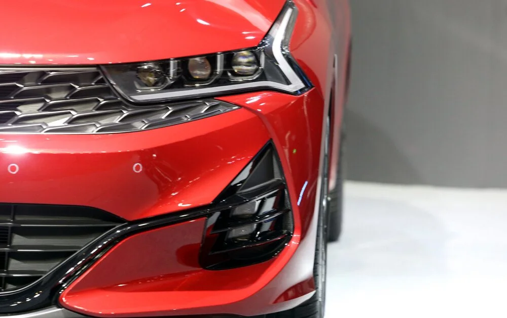 Đầu xe sử dụng lưới tản nhiệt dạng mũi hổ đặc trưng nhưng có kích thước lớn hơn và thiết kế dữ dằn hơn. Xe được trang bị đèn chiếu sáng LED Projector. Thiết kế dải đèn LED chạy ban ngày màu hổ phách với hình dáng chữ “L” được uốn cong bao trọn cụm đèn pha. K5 sử dụng đèn sương mù trước LED. Hốc hút gió được với tạo hình hầm hố được đặt phía dưới giúp tăng tính khí động học cho xe.
