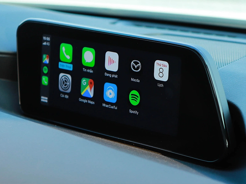 Mazda3 trang bị màn hình giải trí cảm ứng kích thước 8,8 inch được đặt dọc hướng về người lái, kết nối đầy đủ AUX, USB, Apple CarPlay, Android Auto…