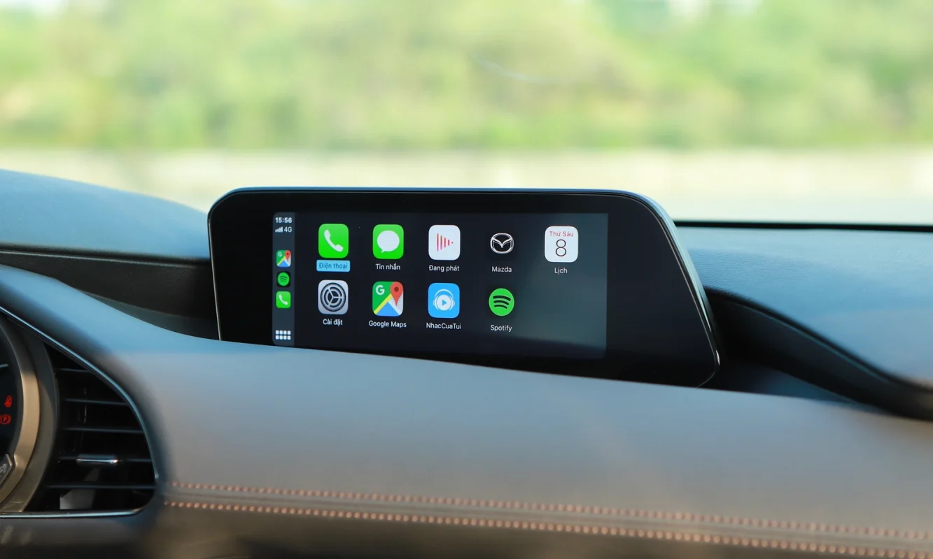 Mazda3 trang bị màn hình giải trí cảm ứng kích thước 8,8 inch được đặt dọc hướng về người lái, kết nối đầy đủ AUX, USB, Apple CarPlay, Android Auto…