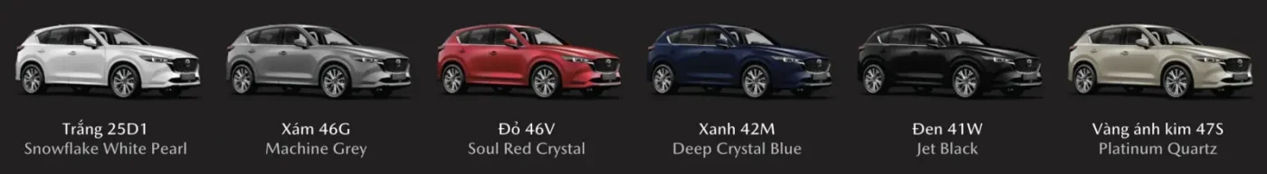 Hiện nay có đến 6 màu xe Mazda CX-5 Luxury đang được bán gồm: Trắng, Xám, Đỏ, Xanh, Đen, Vàng ánh kim.