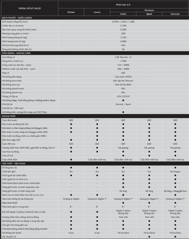 Hiện tại, mẫu xe này chỉ có 3 bản chính là Deluxe, Luxury và Premium, cùng 2 gói đi chọn theo bản Premium là Sport và Exclusive.