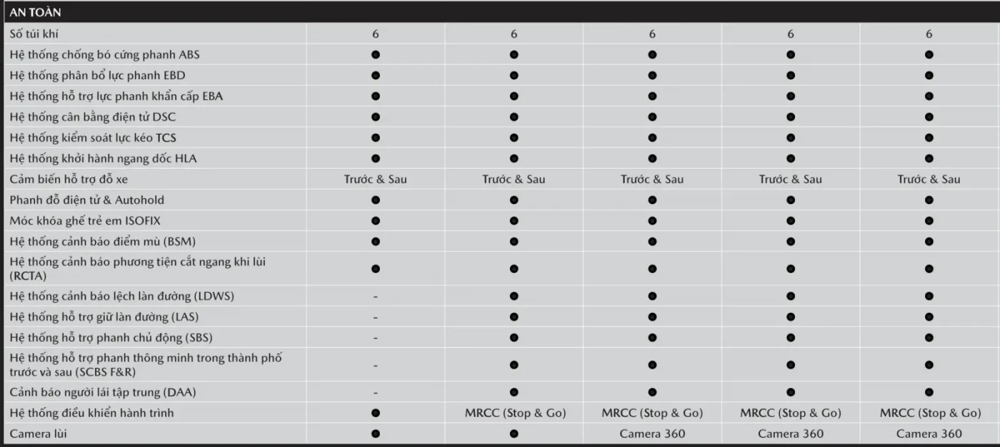 - Cảm biến đỗ xe trước sau, kiểm soát lực kéo, phanh tay điện tử, giữ phanh tự động & 6 túi khí.